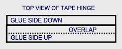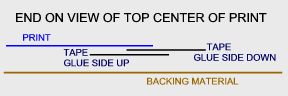 2 to 3 inch pieces of tape (6 inches for a 30x40 print). Place one piece of tape glue side up and the other glue side down, overlapping by 1/4 inch the long way, to become one piece as in the diagram.